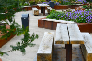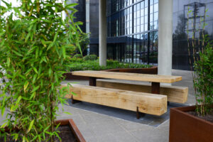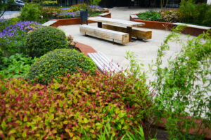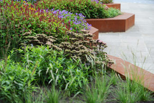Het sleutelwoord circulair is terug te vinden in de gehele bedrijfstuin. Dit betekend dat de gebruikte materialen in deze tuin herbruikbaar en duurzaam zijn. Alle oude verhardingen, banken, putten en hemelwaterafvoerbuizen zijn hergebruikt. Natuurlijk zijn er ook duurzame producten toegevoegd. We hebben mooie robuuste banken van cortenstaal en Nederlands eiken geplaatst. Daarnaast hebben we plantenbakken geplaatst die gemaakt zijn van corstenstaal. Dit geeft een warme uitstraling, maar is ook te demonteren en gemakkelijk te recyclen.