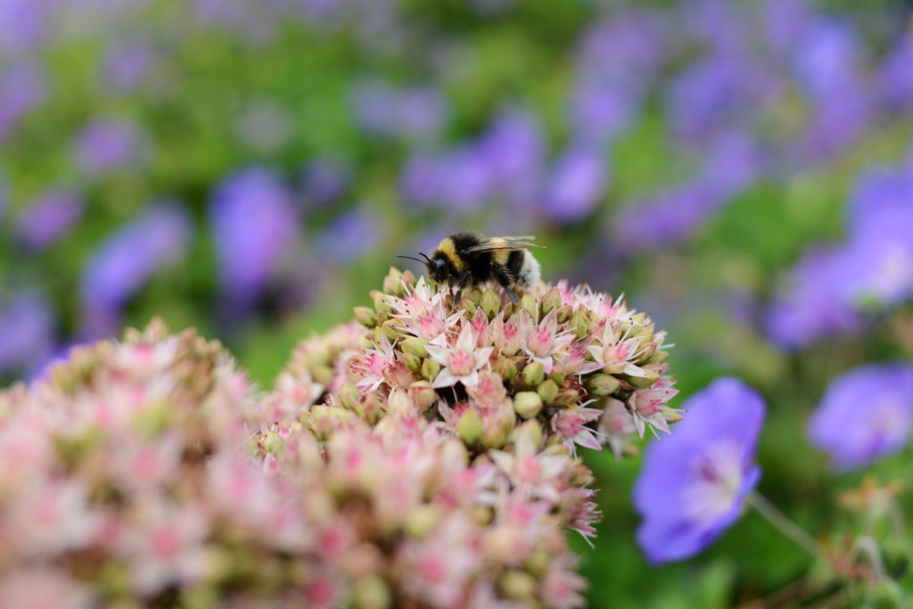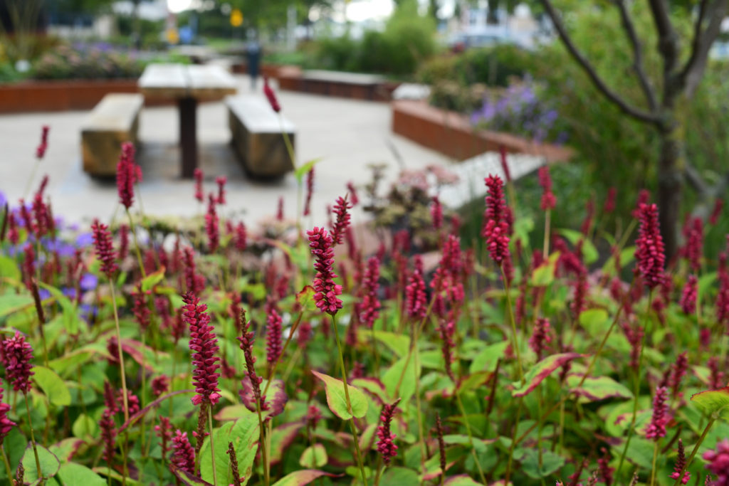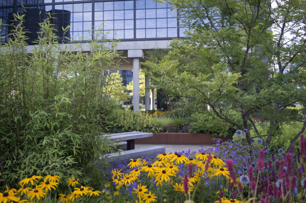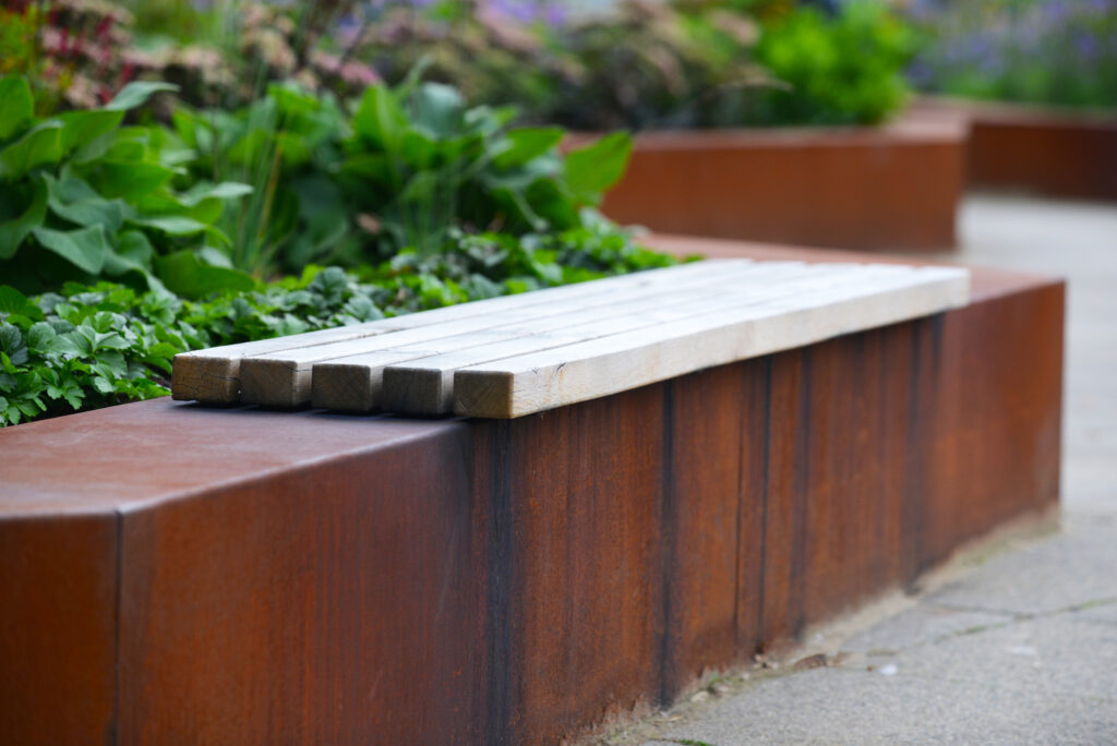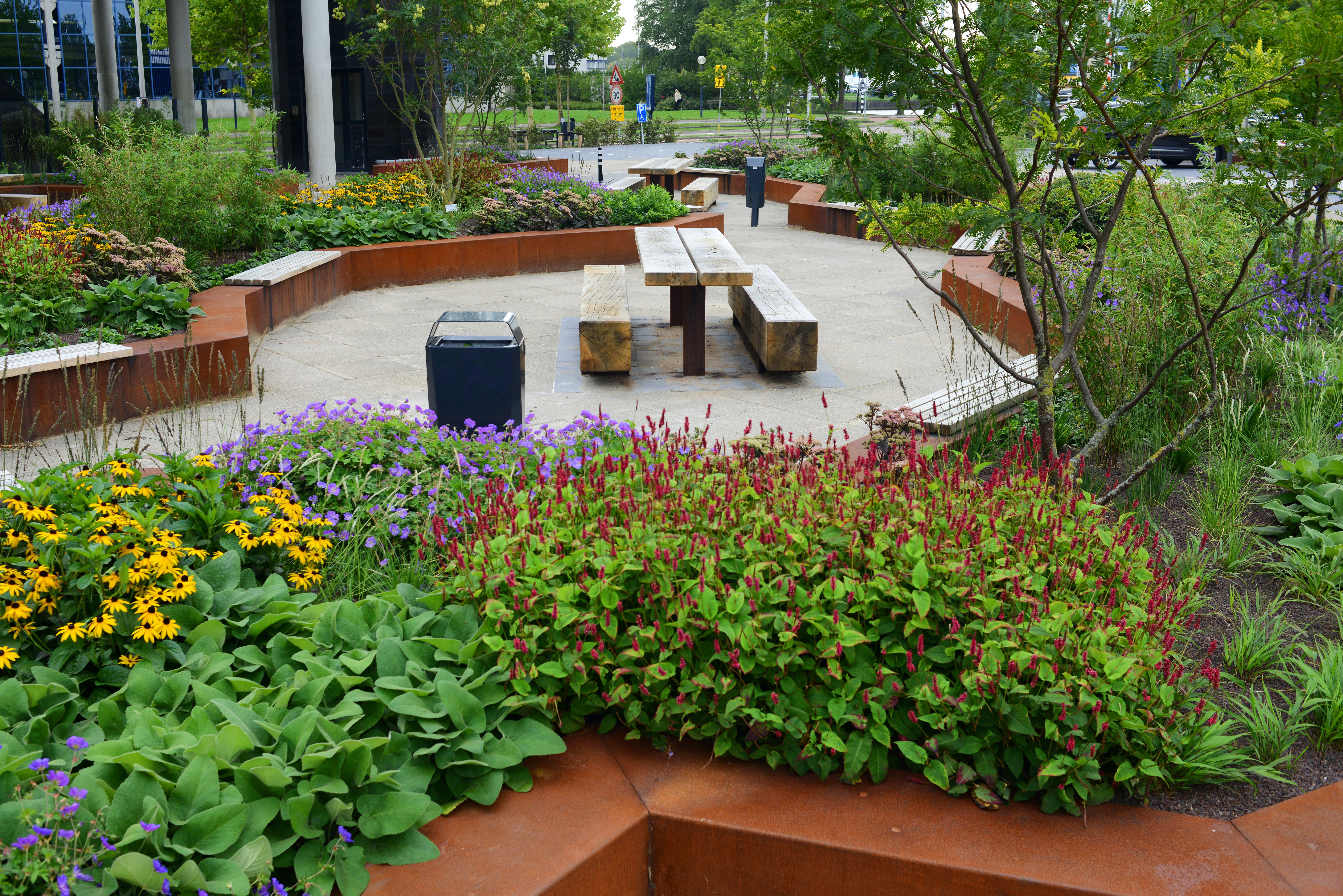 Het sleutelwoord circulair is terug te vinden in de gehele bedrijfstuin. Dit betekend dat de gebruikte materialen in deze tuin herbruikbaar en duurzaam zijn. Alle oude verhardingen, banken, putten en hemelwaterafvoerbuizen zijn hergebruikt. Natuurlijk zijn er ook duurzame producten toegevoegd. We hebben mooie robuuste banken van cortenstaal en Nederlands eiken geplaatst. Daarnaast hebben we plantenbakken geplaatst die gemaakt zijn van corstenstaal. Dit geeft een warme uitstraling, maar is ook te demonteren en gemakkelijk te recyclen.