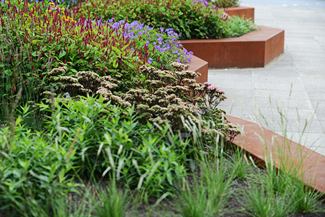 Zomerse bloemen, bruinrode herfstbladeren en winterse silhouetten zijn door het jaar heen te zien in deze kleurrijke buitenruimte. Het cortenstaal geeft een warme uitstraling aan de tuin en de omliggende bebouwing en door het gebruik van rechte lijnen richting de entree voel je je meer dan welkom bij Aegon in Leeuwarden.