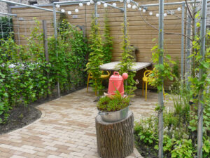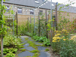 Na het ontwerp gemaakt te hebben, zijn we vrij vlot aan de slag gegaan met de uitvoering. Er is gewerkt met ronde vormen, veel groen en diepte zodat de tuin groter oogt. In de tuin is er een bewuste keuze gemaakt voor bepaalde soorten beplanting, zodat de tuin het gehele jaar voorzien is van interessante kleuren en vormen. Als de ene bloem is uitgebloeid, begint de andere weer. . De gebruikte stenen passen bij de gevelstenen en zijn circulair aangelegd met stenen uit een andere tuin. Omdat er weinig wind tussen de huizen komt, is het in de zomerperiode erg warm in onze tuin. Ook hier is rekening mee gehouden. De klimop in de pergola en de geplaatste bomen bieden een fijne schaduw.