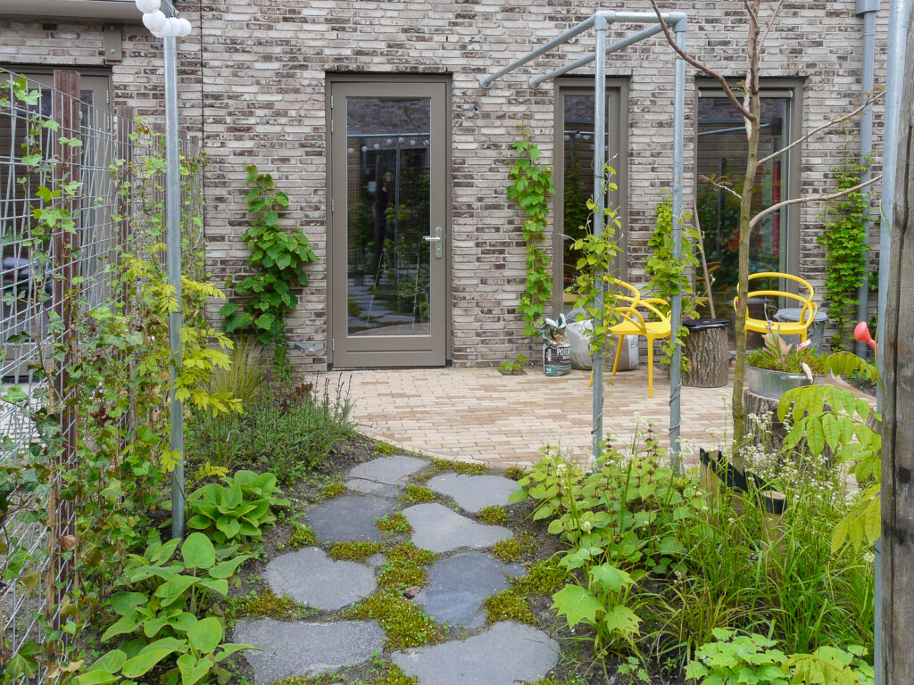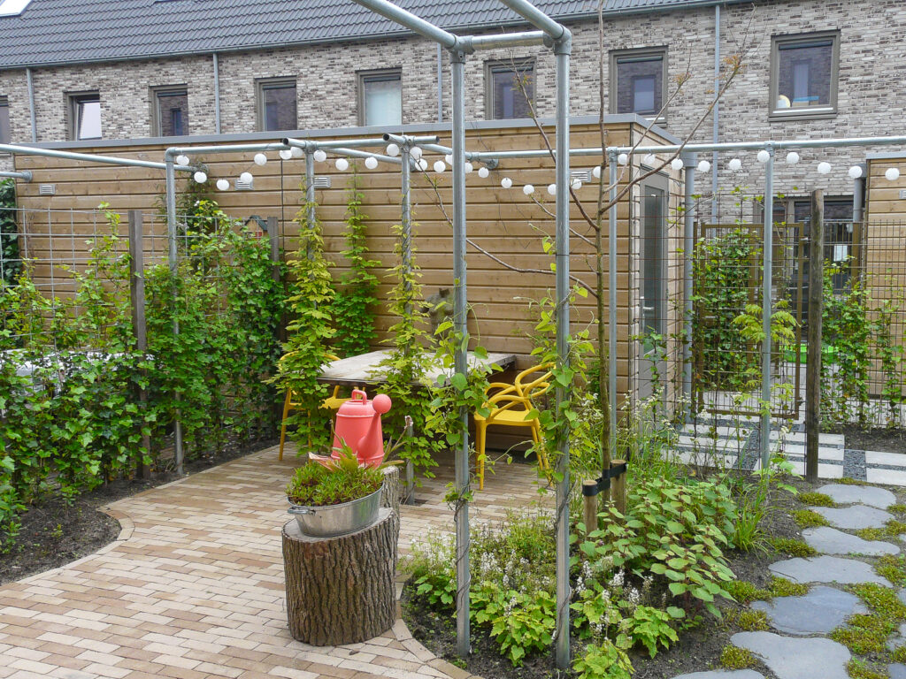 Na het ontwerp gemaakt te hebben, zijn we vrij vlot aan de slag gegaan met de uitvoering. Er is gewerkt met ronde vormen, veel groen en diepte zodat de tuin groter oogt. In de tuin is er een bewuste keuze gemaakt voor bepaalde soorten beplanting, zodat de tuin het gehele jaar voorzien is van interessante kleuren en vormen. Als de ene bloem is uitgebloeid, begint de andere weer. . De gebruikte stenen passen bij de gevelstenen en zijn circulair aangelegd met stenen uit een andere tuin. Omdat er weinig wind tussen de huizen komt, is het in de zomerperiode erg warm in onze tuin. Ook hier is rekening mee gehouden. De klimop in de pergola en de geplaatste bomen bieden een fijne schaduw.
