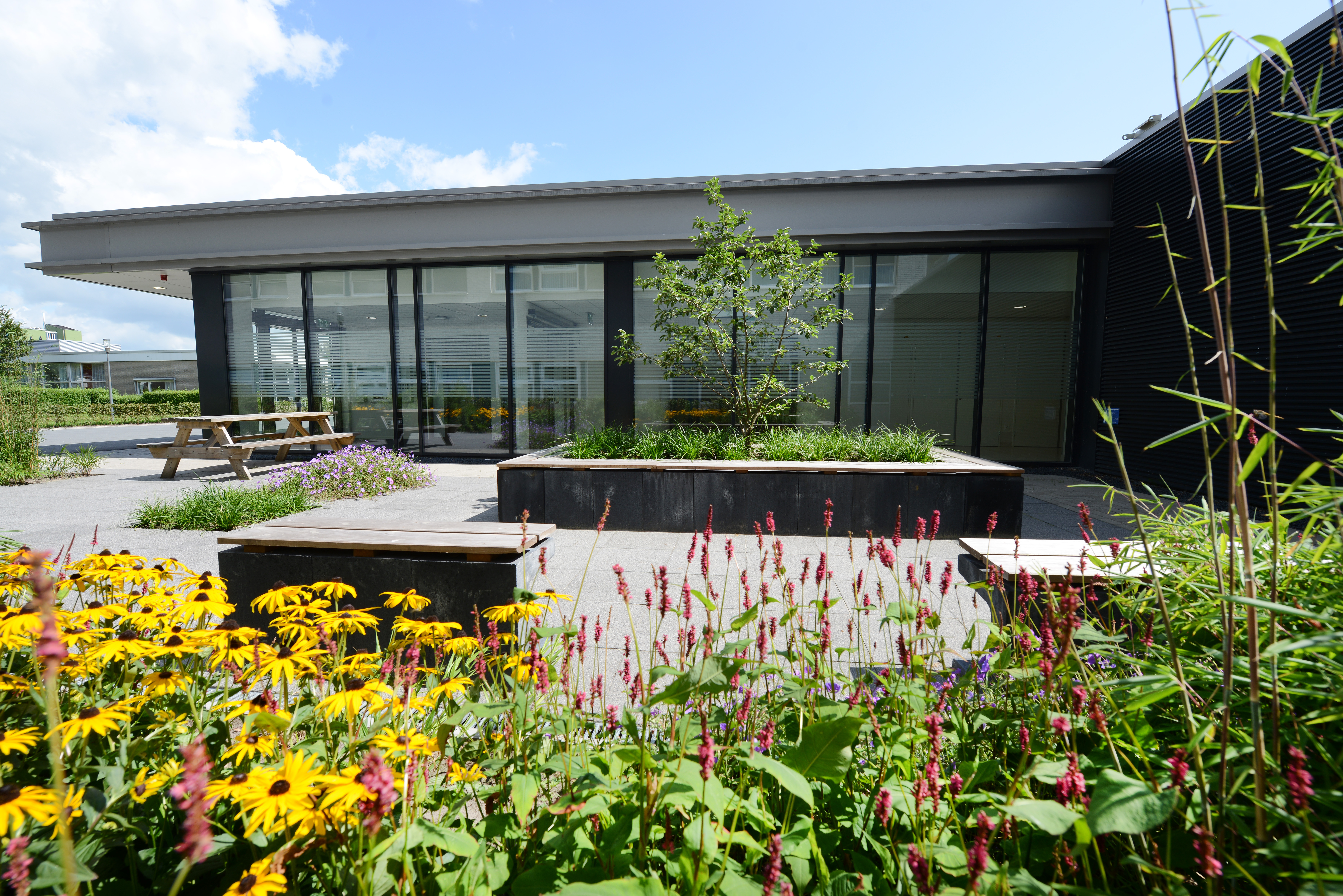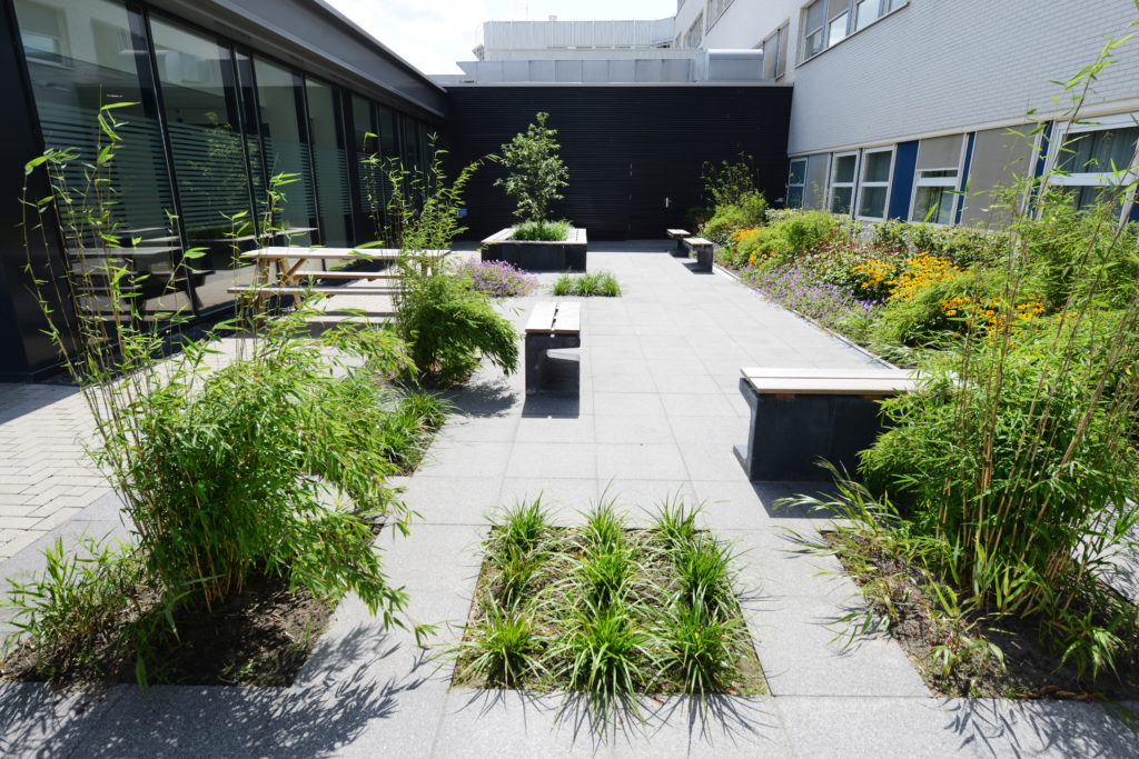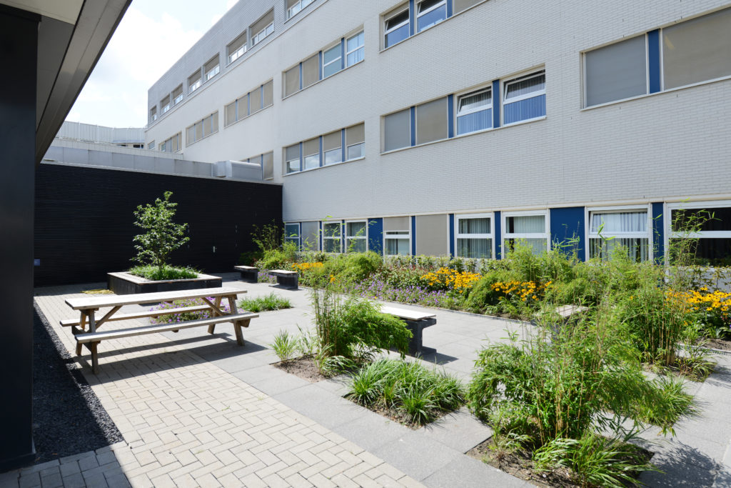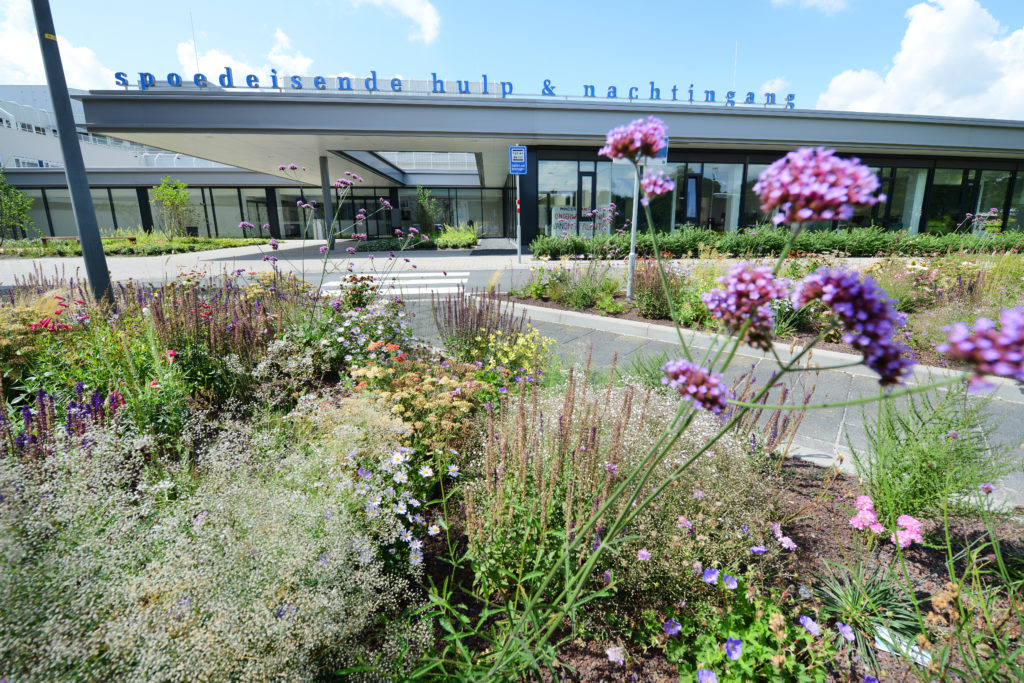 Een plek creëren waar mensen tot rust kunnen komen, nieuws kunnen verwerken en een representatieve aanblik voor de hoofdingang van het spoedplein. Zo luidde de opdracht van het Medisch Centrum Leeuwarden. Belangrijke elementen waar we rekening mee hebben gehouden zijn functionaliteit en beleving. Zo zijn bijvoorbeeld bestaande functionele routes behouden en is met een border met prairiebeplanting de nadruk gelegd op de entree van het spoedplein. Zo weet je in één oogopslag waar de ingang is. Deze border is het gehele jaar interessant qua kleur en vorm, want elk seizoen heeft bij deze beplanting zijn eigen charmes.
