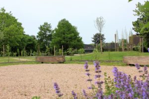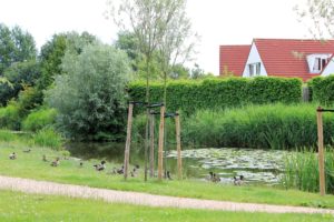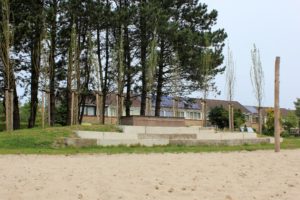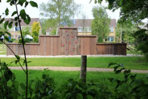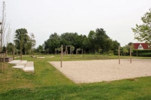 Deze prachtige groene buitenruimte is onderdeel van de Groene Loper Grou om de natuur te beleven. De Groene Loper is een wandelroute door het dorp waarbij diverse groenstroken met elkaar verbonden zijn. Gezamenlijk vormen ze een uitdagende loop-, speel-, sport-, pluk-, eet- en beleefroute waar jong en oud plezier aan kunnen beleven. Dit onderdeel is speciaal gericht op speel- en sport activiteiten. Uitdagende speelelementen halen het kind in iedereen naar boven. Ga op ontdekkingstocht, speel verstoppertje tussen de bomen en wilgenhutten of probeer je evenwicht te houden op de klim- en klauter speelelementen. Doe je liever een balspel? In het zand is een net gespannen voor een gezellig potje volleybal. Wil je liever even ontspannen? Neem dan plaats op de tribune voor een overzicht over het gehele terrein of ga lekker in het gras zitten. Op dit terrein is de natuur voor iedereen dichtbij.