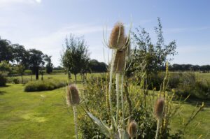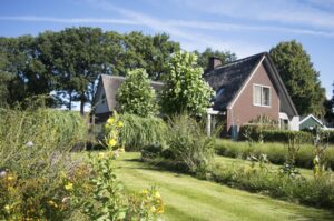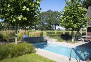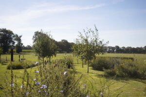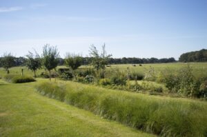 Een moderne landschapstuin waarbij het tuinontwerp zowel een onlosmakende verbinding met het moderne woonhuis als het landschap heeft. Vanuit het woonhuis gezien zitten er strakke elementen in het ontwerp, waarna de tuin over gaat in de golven van het landschap. Hierdoor krijgt de tuin een speels karakter. Deze tuin is heerlijk om in te leven en van alle gemakken voorzien. Zo is er een heerlijk zwembad aangelegd met een duurzame vlonder van hardhout fsc er omheen. Daarnaast is er een moestuin met fruithof waar de lekkerste groeten en fruit uit voort komen en zijn de duurzame schellevis tegels echte blikvangers. In de tuin is er een bewuste keuze gemaakt voor bepaalde soorten beplanting, zodat de tuin het gehele jaar voorzien is van interessante kleuren en vormen. De beplanting is divers. De gazonstroken zijn ingezaaid met wilde bloemen en dichter bij het huis zijn strak geknipte vakken met klimop en hulst te zien. De hoeveelheid aan bloemen trekt veel bijen en vlinders aan . Het is een tuin met optimale biodiversiteit.