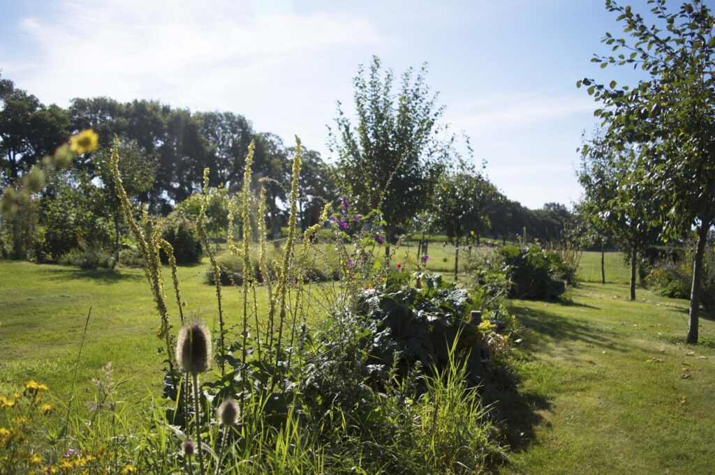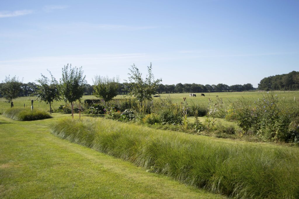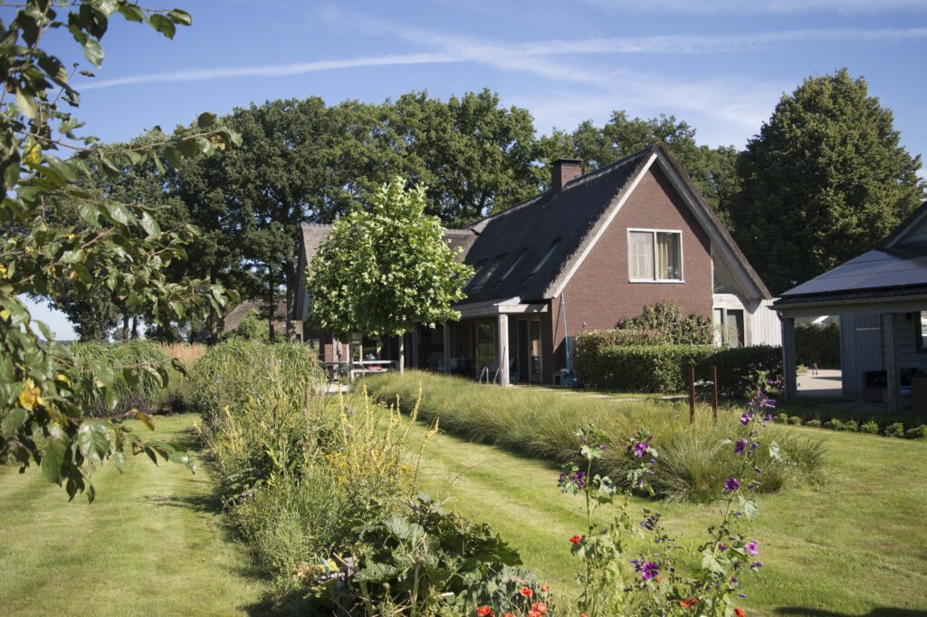 Een moderne landschapstuin waarbij het tuinontwerp zowel een onlosmakende verbinding met het moderne woonhuis als het landschap heeft. Vanuit het woonhuis gezien zitten er strakke elementen in het ontwerp, waarna de tuin over gaat in de golven van het landschap. Hierdoor krijgt de tuin een speels karakter. Deze tuin is heerlijk om in te leven en van alle gemakken voorzien. Zo is er een heerlijk zwembad aangelegd met een duurzame vlonder van hardhout fsc er omheen. Daarnaast is er een moestuin met fruithof waar de lekkerste groeten en fruit uit voort komen en zijn de duurzame schellevis tegels echte blikvangers. In de tuin is er een bewuste keuze gemaakt voor bepaalde soorten beplanting, zodat de tuin het gehele jaar voorzien is van interessante kleuren en vormen. De beplanting is divers. De gazonstroken zijn ingezaaid met wilde bloemen en dichter bij het huis zijn strak geknipte vakken met klimop en hulst te zien. De hoeveelheid aan bloemen trekt veel bijen en vlinders aan . Het is een tuin met optimale biodiversiteit.