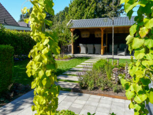 Een fijne tuin met veel kleur en met een heerlijke zitplek. Deze moderne leeftuin is van alle gemakken voorzien en is bovendien ook nog innovatief. Zo is er In de tuin is een beregeningssysteem toegepast. Daarnaast houdt de maairobot het gras in topconditie. Met oog voor het woonhuis is gekozen voor een rustige verharding welke de tuin tegelijkertijd ook een speels karakter geeft. De toepassing van stoere buizen met klimplanten is een unieke eyecatcher van deze tuin en brengt een mooie verbinding van het ene naar het andere terras.