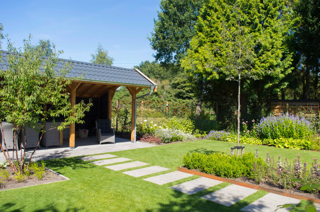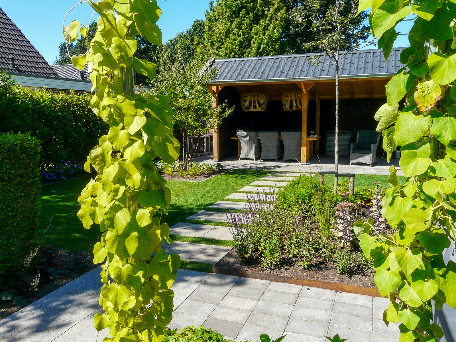 Middels het gebruik van vaste planten met verschillende bladcontrasten is het gevoel van seizoensbeleving optimaal gerealiseerd. De cortenstalen randen van de borders geeft extra kracht en warmte aan de tuin. Bestaande bomen geven een fijne schaduw in de zomer om de warmte tegen te gaan. In de toekomst zullen de nieuwe bomen een stukje privacy geven. De kapschuur is een heerlijk plek om in te zitten. een echte outdoor living met fraaie tafel, sfeervolle lampen en heerlijke stoelen. Duurzame verlichting van In-lite zorgt in het donker voor een feeërieke sfeer. Achter de kapschuur is een verrassend moestuintje te vinden en tegelijkertijd ook een heerlijke plek om rustig bij te komen van een drukke dag. Al met al een tuin om puur te genieten!