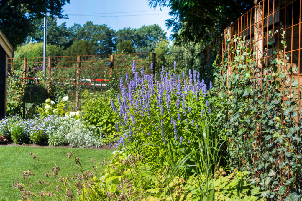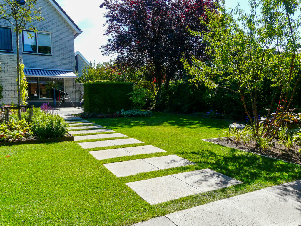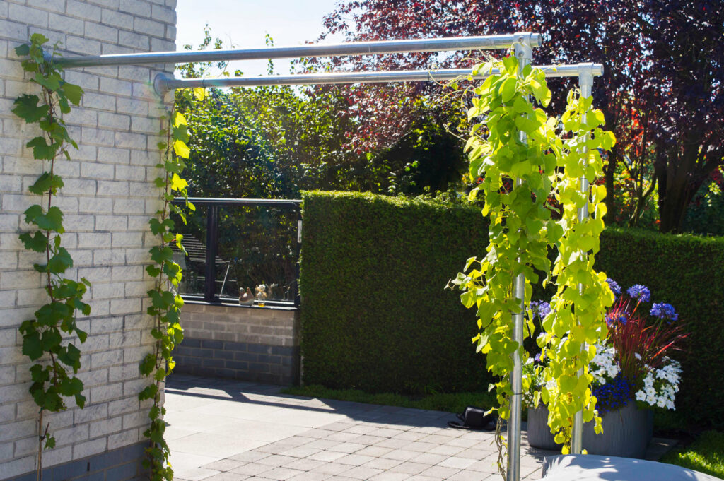 Een fijne tuin met veel kleur en met een heerlijke zitplek. Deze moderne leeftuin is van alle gemakken voorzien en is bovendien ook nog innovatief. Zo is er In de tuin is een beregeningssysteem toegepast. Daarnaast houdt de maairobot het gras in topconditie. Met oog voor het woonhuis is gekozen voor een rustige verharding welke de tuin tegelijkertijd ook een speels karakter geeft. De toepassing van stoere buizen met klimplanten is een unieke eyecatcher van deze tuin en brengt een mooie verbinding van het ene naar het andere terras.