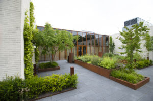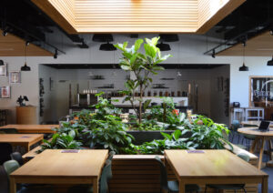 Bij binnenkomst in het restaurant, valt het groene karakter gelijk op. De eyecatchers van het restaurant zijn de grote plantenbak in het midden van het restaurant en de groene wanden. Deze zorgen voor een groen statement. Op het terras in de tuin bevinden zich verhoogde cortenstalen bakken. Door een cortenstalen bak door trekken in de plantenbak, ontstaat er een verbinding met binnen naar buiten. De plantenbak en wanden zijn voorzien van diverse planten met verschillende bladtexturen en kleurtinten. Dit verhoogd de belevingswaarde.