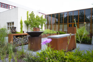 Een plek welke een representatieve uitstraling heeft voor gasten, waar aandacht is voor biodiversiteit en circulariteit en waar planten en kruiden zelf worden gekweekt voor gebruik in de keuken. Dit zijn de voorwaarden waar het ontwerp van het terras aan moet voldoen en waar ook de 5 principes van het concept in terug te vinden zijn. In de tuin zijn vaste eetbare planten verwerkt, waar heerlijke planten en kruiden in te vinden zijn. Samen met Lageschaar Vaste Planten hebben we de allereerste eetbaar mix ontwikkelt, en is daarmee uniek! De eetbare planten kunnen als garnering of smaakmakers gebruikt worden in gerechten. Het doel is om studenten kennis te laten maken met en te leren werken met seizoensgebonden verse producten. Contact met een levend product en met de natuur in plaats van alles te kopen bij een groothandel. Leren om producten uit eigen tuin te gebruiken. Het gaat hierbij over beleving van de kok en de consument.