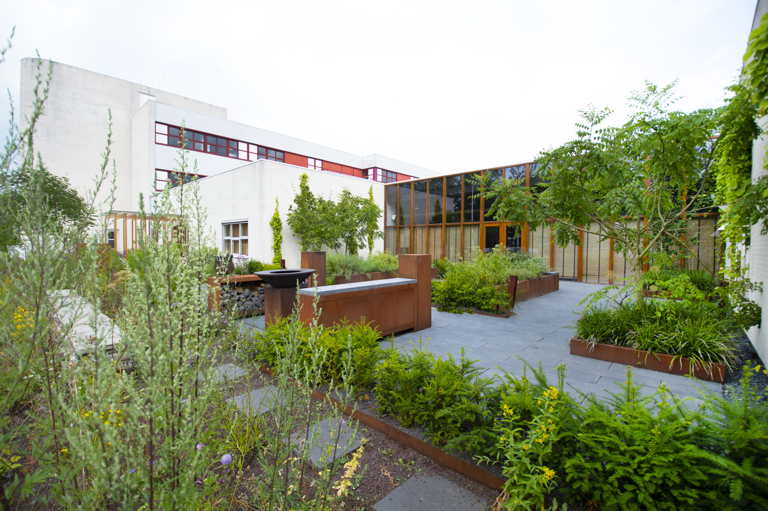 Een plek welke een representatieve uitstraling heeft voor gasten, waar aandacht is voor biodiversiteit en circulariteit en waar planten en kruiden zelf worden gekweekt voor gebruik in de keuken. Dit zijn de voorwaarden waar het ontwerp van het terras aan moet voldoen en waar ook de 5 principes van het concept in terug te vinden zijn. In de tuin zijn vaste eetbare planten verwerkt, waar heerlijke planten en kruiden in te vinden zijn. Samen met Lageschaar Vaste Planten hebben we de allereerste eetbaar mix ontwikkelt, en is daarmee uniek! De eetbare planten kunnen als garnering of smaakmakers gebruikt worden in gerechten. Het doel is om studenten kennis te laten maken met en te leren werken met seizoensgebonden verse producten. Contact met een levend product en met de natuur in plaats van alles te kopen bij een groothandel. Leren om producten uit eigen tuin te gebruiken. Het gaat hierbij over beleving van de kok en de consument.