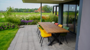 Bij het ontwerpen van de tuin staan de eigen wensen centraal. Zo is er een moestuin gemaakt waar heerlijke verse groenten worden verbouwd. Ook de kippen hebben een prachtig kippenhok en is er ruimte voor een jacuzzi en sauna om te relaxen. Er zijn meerdere beschutte terrassen aangelegd. Vanuit elk terras is er weer een verrassende beleving te zien. De tuin sluit goed aan bij de architectuur van de woning en straalt rust en eenheid uit en is er aandacht voor privacy in de tuin. Na het ontwerp gemaakt te hebben, zijn we vrij vlot aan de slag gegaan met de uitvoering.