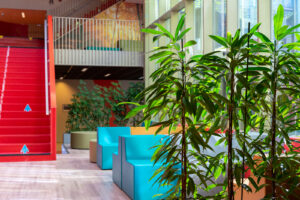 We weten dat planten CO2 omzetten in zuurstof én dat uitzicht op planten een positief effect heeft op de leerprestaties. Daarom zijn planten in een leeromgeving een heel goed idee. Daarnaast is het aan te raden om ook de algemene ruimten voldoende te voorzien van natuurlijke elementen. De pauzes worden daarmee echt een rustmoment voor zowel de leerlingen als ook voor de leraren. Bij OSG Singelland in Drachten mochten we deze prachtige binnenbeplanting leveren. Lunchen of leren op het gezellig gekleurd meubilair? Met hoge plantenbakken heb je altijd groen gezelschap!