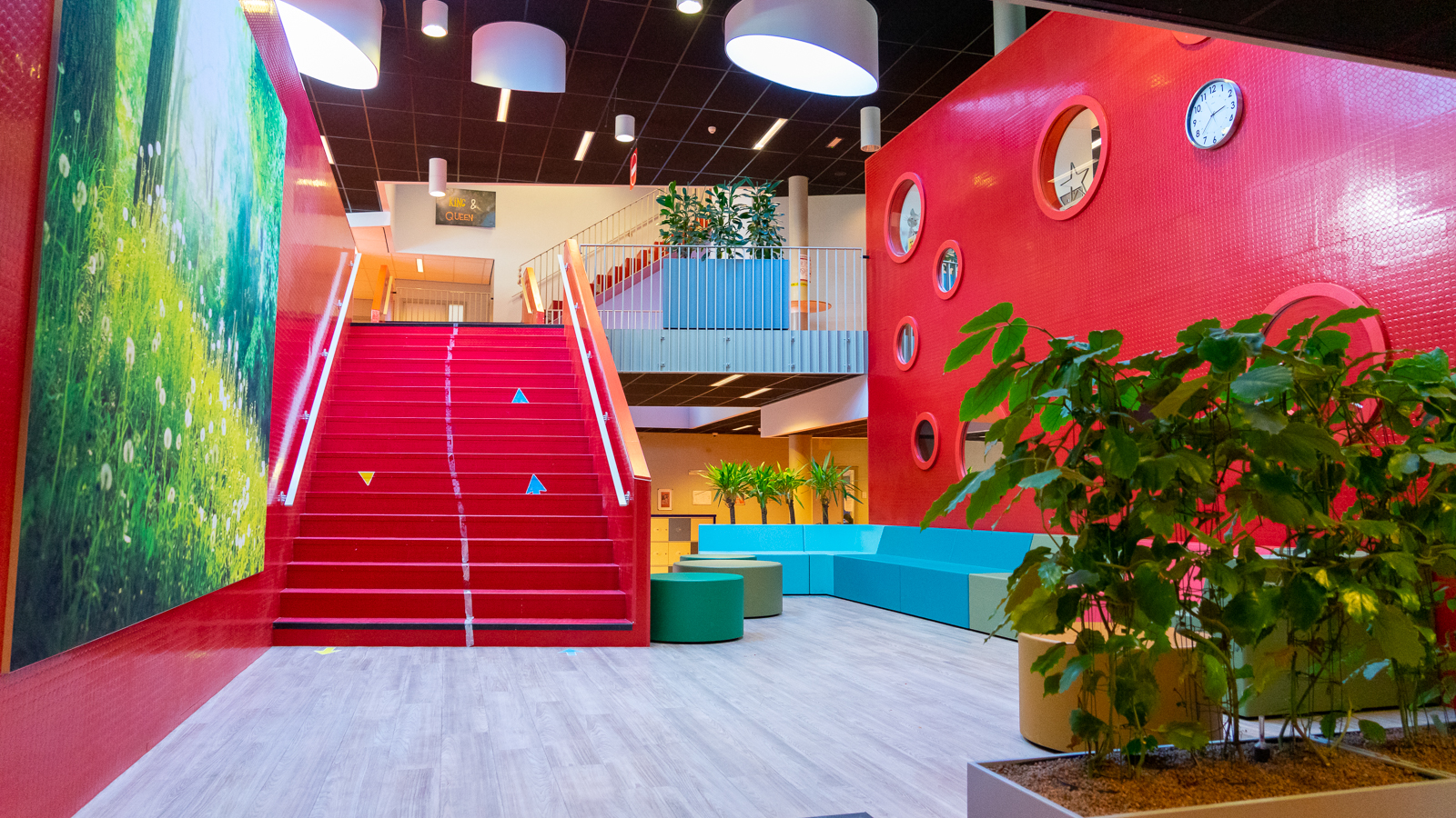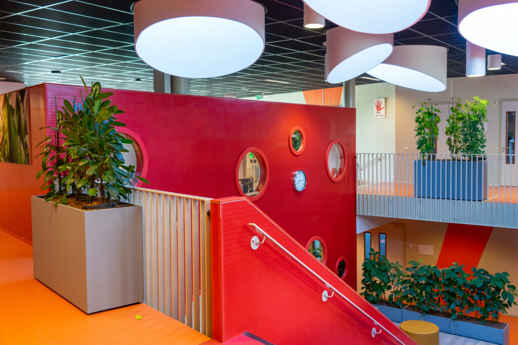 We weten dat planten CO2 omzetten in zuurstof én dat uitzicht op planten een positief effect heeft op de leerprestaties. Daarom zijn planten in een leeromgeving een heel goed idee. Daarnaast is het aan te raden om ook de algemene ruimten voldoende te voorzien van natuurlijke elementen. De pauzes worden daarmee echt een rustmoment voor zowel de leerlingen als ook voor de leraren. Bij OSG Singelland in Drachten mochten we deze prachtige binnenbeplanting leveren. Lunchen of leren op het gezellig gekleurd meubilair? Met hoge plantenbakken heb je altijd groen gezelschap!