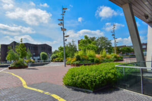 Het Kennisplein ontstond vanuit een pop-uppark. Deze bestond uit big bags en een tijdelijke groeninvulling. De beide tuinelementen legden we in 2018 aan. Dit diende als tijdelijke oplossing om de NHL en Stenden te verbinden na de fusie. Dit jaar maakten we het pop-uppark definitief door randen van cortenstaal rondom de big bags te creëren. Hierdoor zijn de plantvakken groter geworden en heeft de beplanting meer ruimte om te groeien. In de bloembakken brachten we zitelementen aan, waarop studenten hun pauzes kunnen doorbrengen.