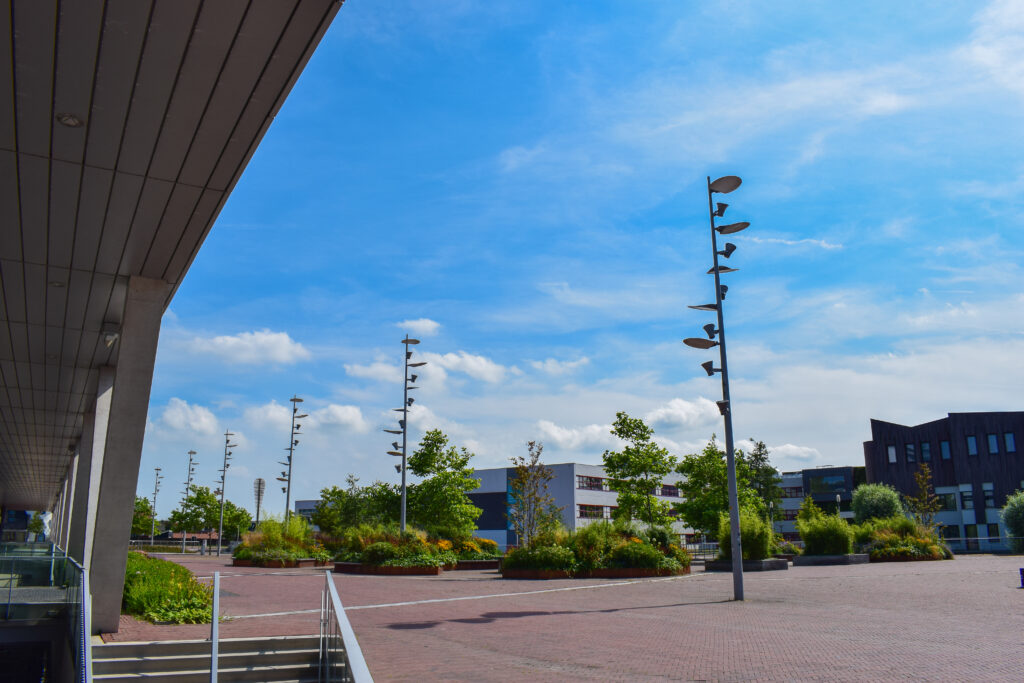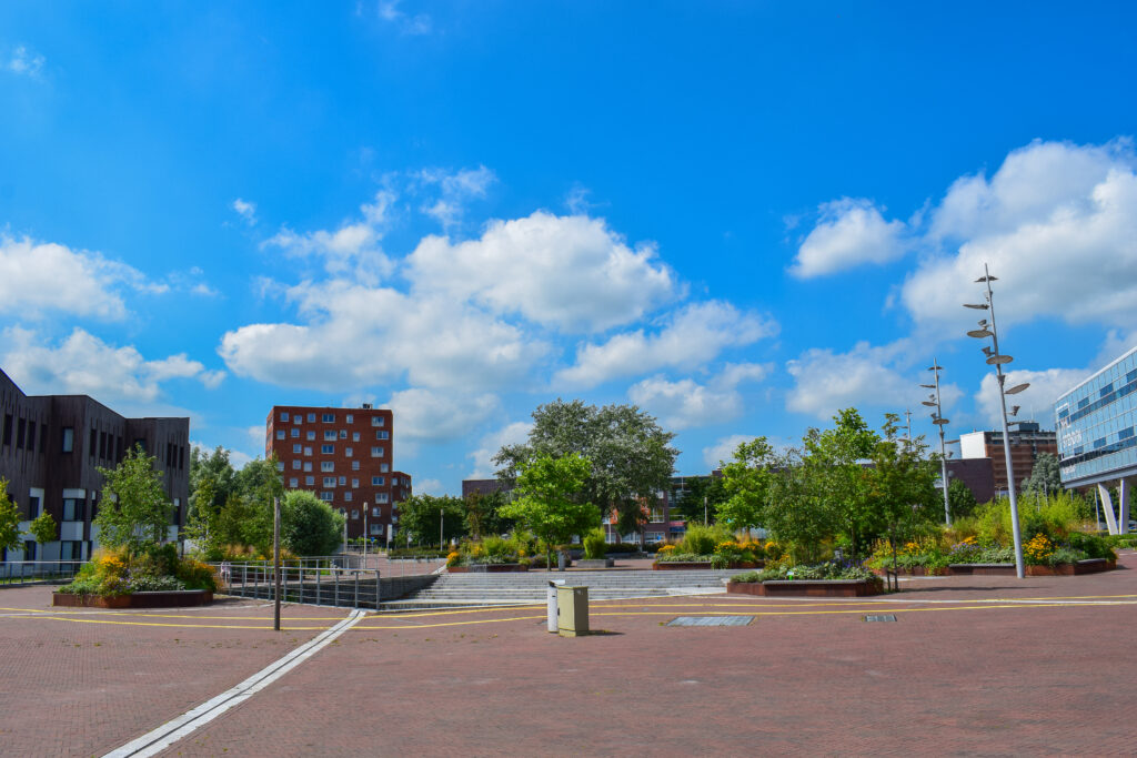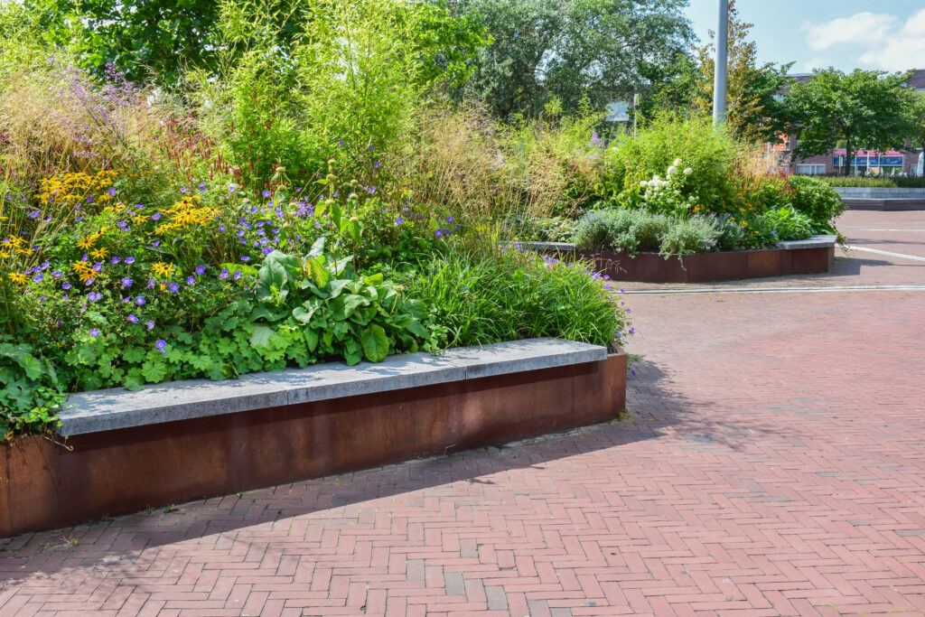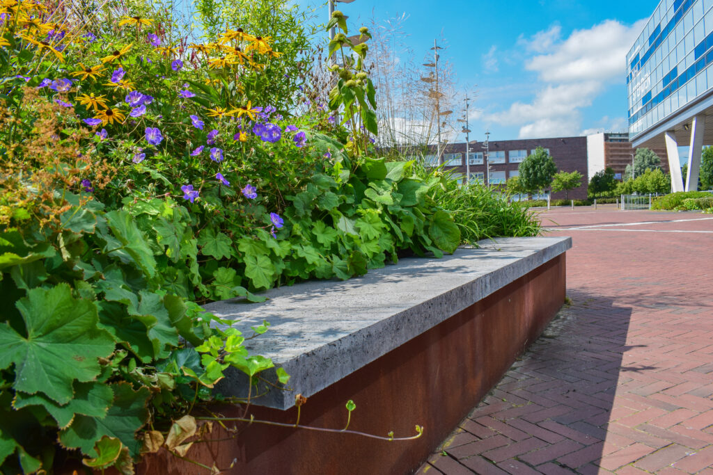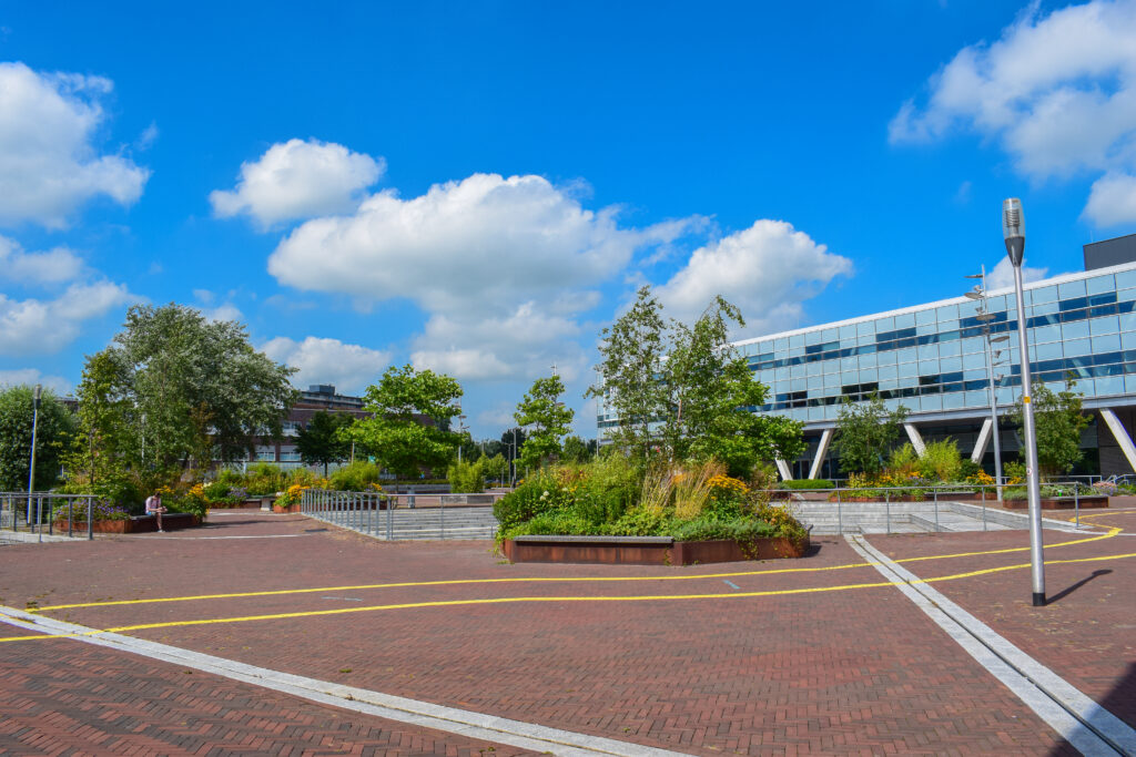 Het Kennisplein ontstond vanuit een pop-uppark. Deze bestond uit big bags en een tijdelijke groeninvulling. De beide tuinelementen legden we in 2018 aan. Dit diende als tijdelijke oplossing om de NHL en Stenden te verbinden na de fusie. Dit jaar maakten we het pop-uppark definitief door randen van cortenstaal rondom de big bags te creëren. Hierdoor zijn de plantvakken groter geworden en heeft de beplanting meer ruimte om te groeien. In de bloembakken brachten we zitelementen aan, waarop studenten hun pauzes kunnen doorbrengen.