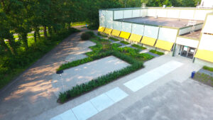In de oude situatie van het gebied waren veel industrieplaten en betonklinkers gebruikt. Deze zijn hergebruikt in het nieuwe ontwerp en zijn als zichtbare lijn richting de hoofdingang gelegd, waardoor ze een routefunctie hebben gekregen. De industrieplanten zijn verweven met de betonklinkers wat zorgt voor een spannend geheel. Dit pad loopt door tot in de beplanting. Zo is het gehele gebied met elkaar verbonden en valt het als een puzzel in elkaar. Voor een deel is de beplanting als het ware aan het gebouw vastgeplakt. In de oude situatie bestond er een grindstrook tegen het pand aan. Deze is vervangen door een strook van siergras. Hierdoor hebben leerlingen en docenten direct zicht op groen. Veel leerlingen gebruiken een scooter als vervoersmiddel, waar op het plein een parkeerplek voor gecreëerd diende te worden. Om het rustige beeld vast te houden is de parkeerplek omheint door een beukenhaag, waardoor de scooters niet zichtbaar zijn.