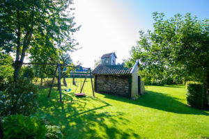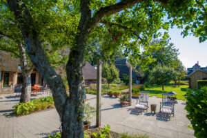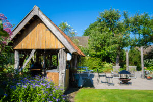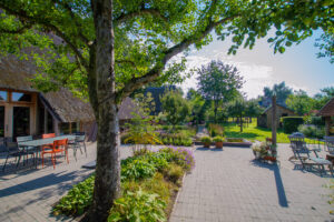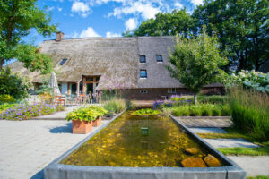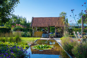 Als je vanaf het keukengedeelte naar buiten kijkt, zie je een spiegelvijver. Kijkend in de lengterichting lijkt de vijver groter dan hij daadwerkelijk is. De vijver is aantrekkelijk voor amfibieën, libellen en andere insecten. De borders rondom deze vijver zijn kleurrijk, waardoor het geheel een echte eyecatcher is geworden. De gehandhaafde oude appelbomen behouden de sfeer van het boerenerf.