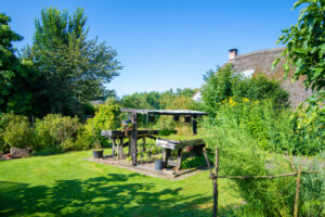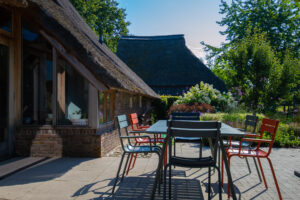 Naast biodiversiteit is er ook nagedacht over klimaatadaptatie. We maakten een grindbak om de boerderij heen, waarin het regenwater van het rieten dak wordt opgevangen. De grindbak infiltreert het regenwater in de grond. Ook door het vele groen kan het overtollige regenwater op een natuurlijke wijze infiltreren in de grond.