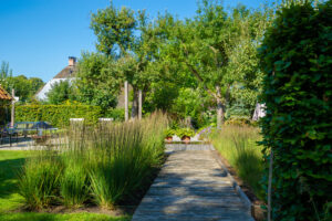In het ontwerp zien we een eikenhouten pad van planken. Dit vormt een verbinding met het bestaande gedeelte van de tuin. Het gazon is gedeeltelijk vervangen door een terras. Zo krijgt de bestaande kas een hele andere uitstraling en wordt het onderdeel van het terras. De nieuwe border rondom het terras werd aangevuld met vaste, kleurrijke beplanting en siergrassen. De kleurrijke beplanting past goed bij het boerenerf.