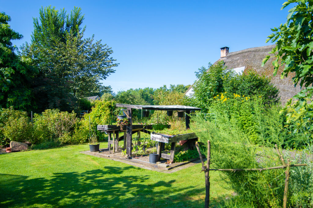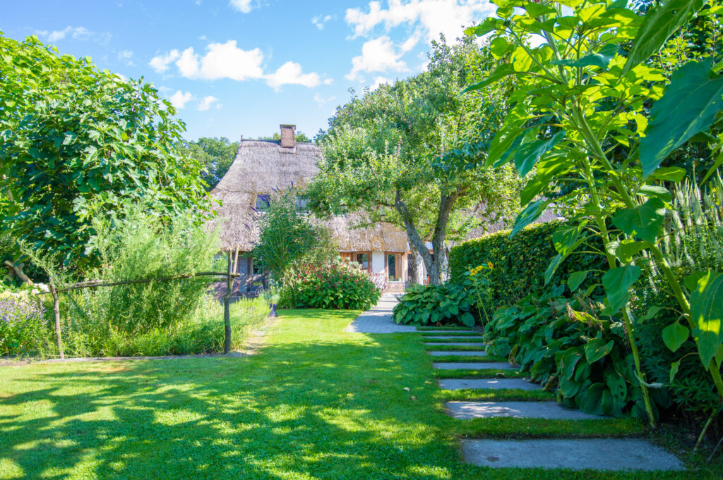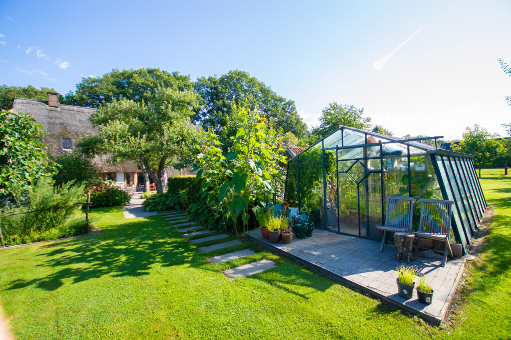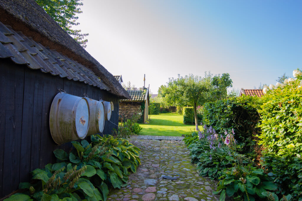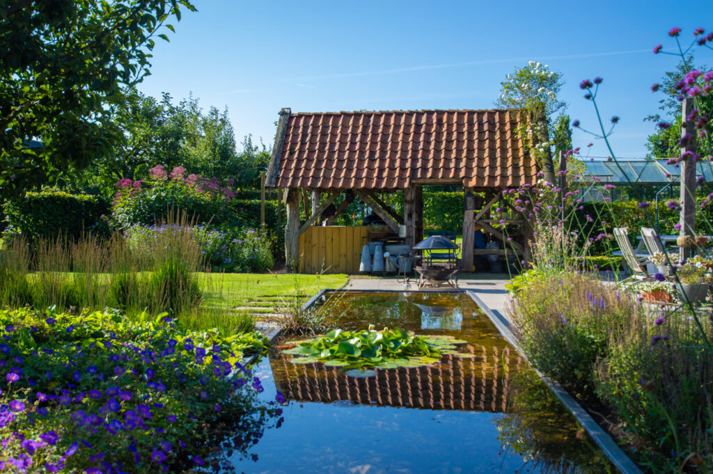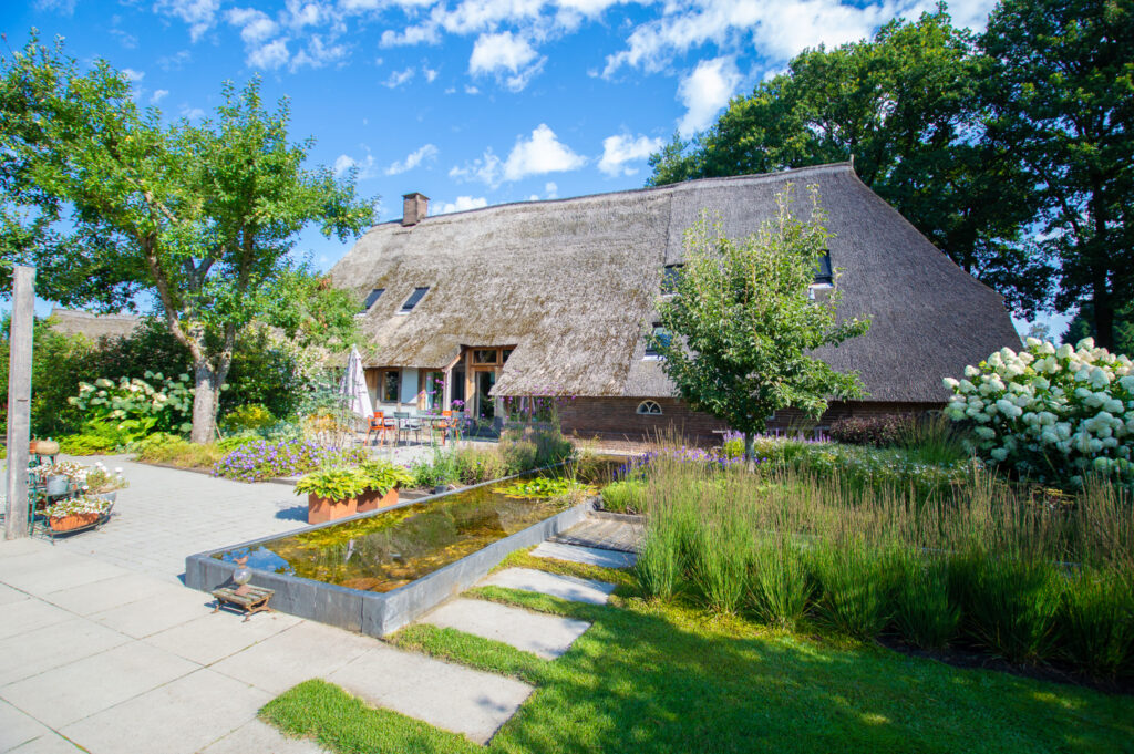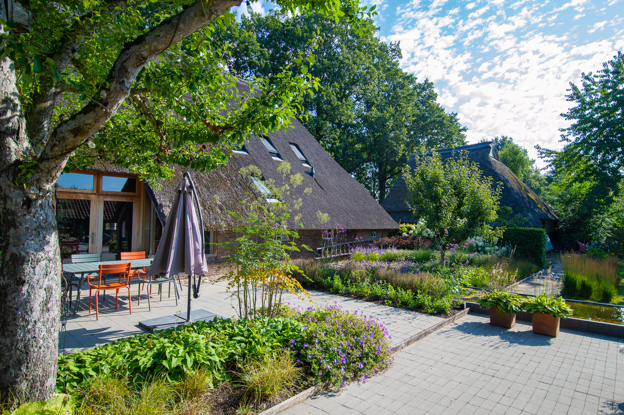 Als je vanaf het keukengedeelte naar buiten kijkt, zie je een spiegelvijver. Kijkend in de lengterichting lijkt de vijver groter dan hij daadwerkelijk is. De vijver is aantrekkelijk voor amfibieën, libellen en andere insecten. De borders rondom deze vijver zijn kleurrijk, waardoor het geheel een echte eyecatcher is geworden. De gehandhaafde oude appelbomen behouden de sfeer van het boerenerf.