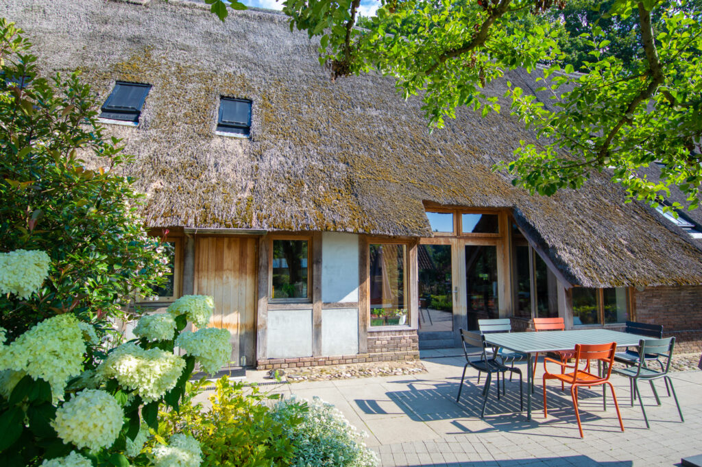 Naast biodiversiteit is er ook nagedacht over klimaatadaptatie. We maakten een grindbak om de boerderij heen, waarin het regenwater van het rieten dak wordt opgevangen. De grindbak infiltreert het regenwater in de grond. Ook door het vele groen kan het overtollige regenwater op een natuurlijke wijze infiltreren in de grond.