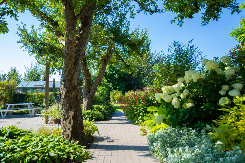 In het ontwerp zien we een eikenhouten pad van planken. Dit vormt een verbinding met het bestaande gedeelte van de tuin. Het gazon is gedeeltelijk vervangen door een terras. Zo krijgt de bestaande kas een hele andere uitstraling en wordt het onderdeel van het terras. De nieuwe border rondom het terras werd aangevuld met vaste, kleurrijke beplanting en siergrassen. De kleurrijke beplanting past goed bij het boerenerf.