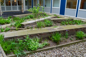 Van de verwijderde tegels maakten we stapelmuren om hergebruik te stimuleren en het transport door het MCL te beperken vanwege de richtlijnen op het gebied van hygiëne. Bij het maken van de stapelmuren zochten we naar speelsheid door middel van verspringingen in de tegels. Daarnaast brachten we een warme kleur in de stapelmuren aan door roodkleurige klinkers te hergebruiken van tuinen die we eerder renoveerden. De roodkleurige klinkers geven meer kleur aan de stapelmuren en de binnentuinen.