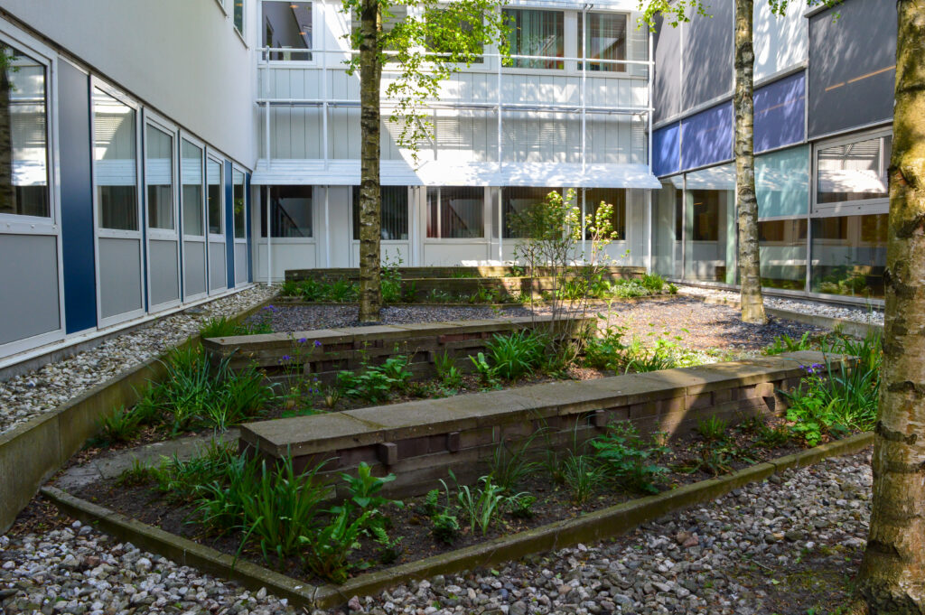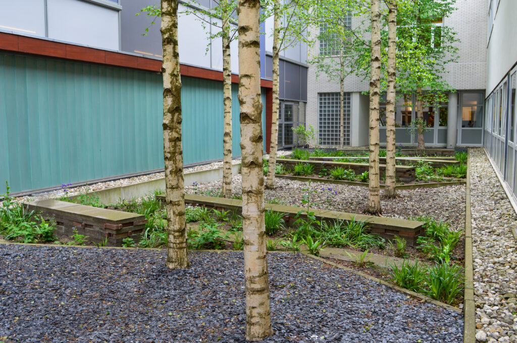 De bestaande binnentuinen boden vanuit de ziekenhuiskamers en kantoorruimtes uitzicht op hoge berken. Van deze bomen controleerden we de vitaliteit. Alle berken bleken nog vitaal genoeg om te behouden. Verder bestonden de binnentuinen uit tegels en grindstroken met varens. De rijen met tegels hadden een rustige en ritmische uitstraling die we graag wilden behouden. Echter hadden de planten meer ruimte nodig om te kunnen groeien. Daarom verwijderden we een aantal tegelrijen en wisselden we deze af met plantstroken.