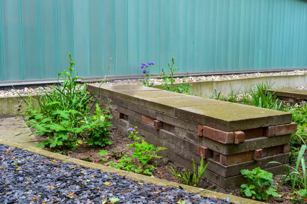 Van de verwijderde tegels maakten we stapelmuren om hergebruik te stimuleren en het transport door het MCL te beperken vanwege de richtlijnen op het gebied van hygiëne. Bij het maken van de stapelmuren zochten we naar speelsheid door middel van verspringingen in de tegels. Daarnaast brachten we een warme kleur in de stapelmuren aan door roodkleurige klinkers te hergebruiken van tuinen die we eerder renoveerden. De roodkleurige klinkers geven meer kleur aan de stapelmuren en de binnentuinen.