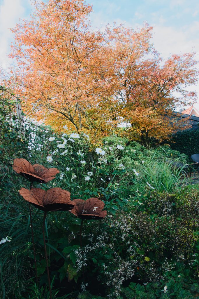 Zomerse bloemen, bruinrode herfstbladeren en winterse silhouetten zijn door het jaar heen te zien in deze kleurrijke buitenruimte. Het cortenstaal geeft een warme uitstraling aan de tuin en de omliggende bebouwing en door het gebruik van rechte lijnen richting de entree voel je je meer dan welkom bij Aegon in Leeuwarden.