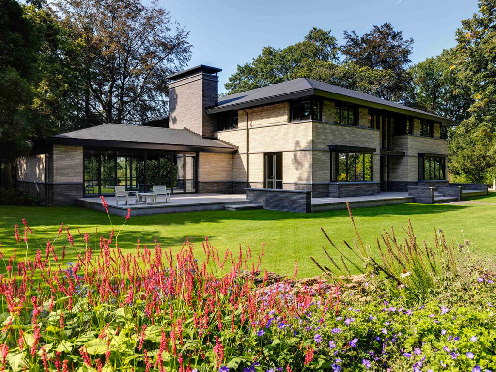 Een moderne landschapstuin waarbij het tuinontwerp zowel een onlosmakende verbinding met het moderne woonhuis als het landschap heeft. Vanuit het woonhuis gezien zitten er strakke elementen in het ontwerp, waarna de tuin over gaat in de golven van het landschap.
