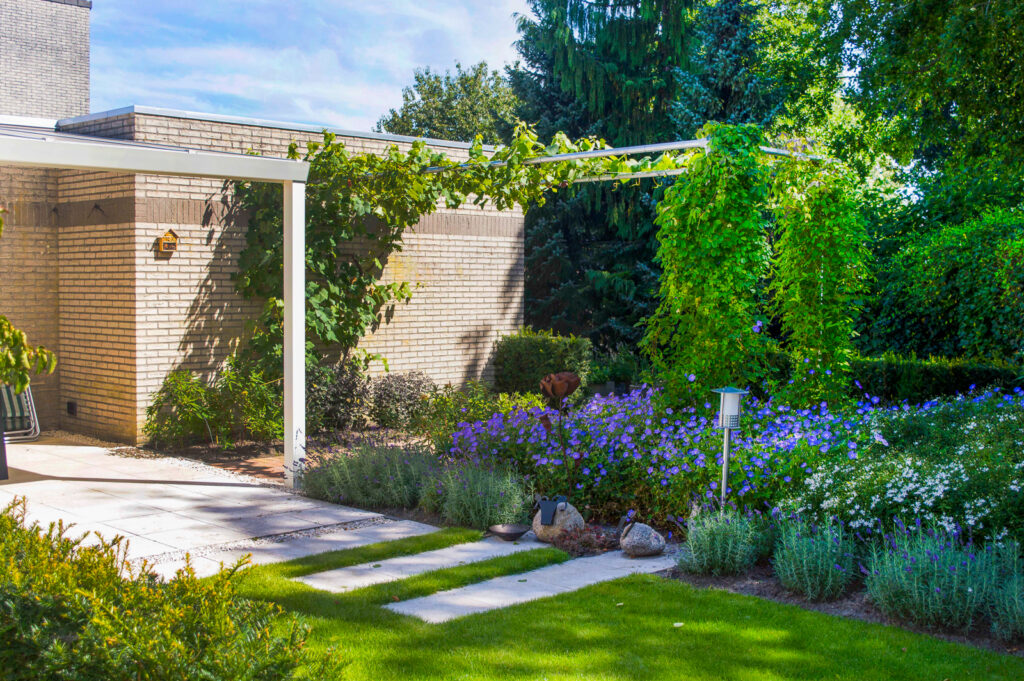 Deze tuinrenovatie leidde tot grote tevredenheid bij de klant. Met de toepassing van veel kleur, twee terrassen om heerlijk te vertoeven en ruimte om een moestuin te hebben, is deze flink opgeknapt.