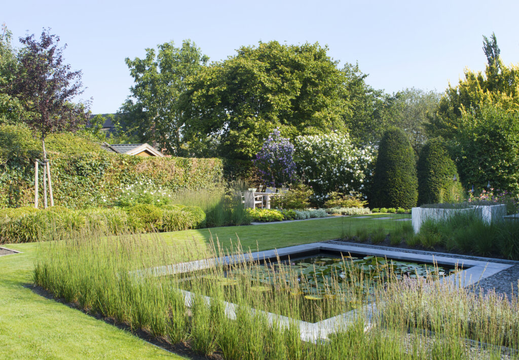 Deze moderne leeftuin is gemaakt voor echte buitenmensen. De strakke vormgeving, met moderne elementen van cortenstaal zorgen voor een warme sfeer. De vijver is gerenoveerd en omkleed met lood, waardoor de vijver de eyecatcher van de tuin wordt.