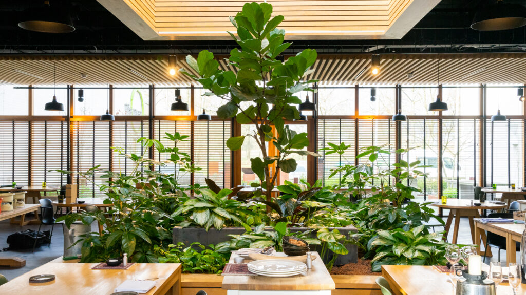 Bij binnenkomst in het restaurant, valt het groene karakter gelijk op. De eyecatchers van het restaurant zijn de grote plantenbak in het midden van het restaurant en de groene wanden. Deze zorgen voor een groen statement.