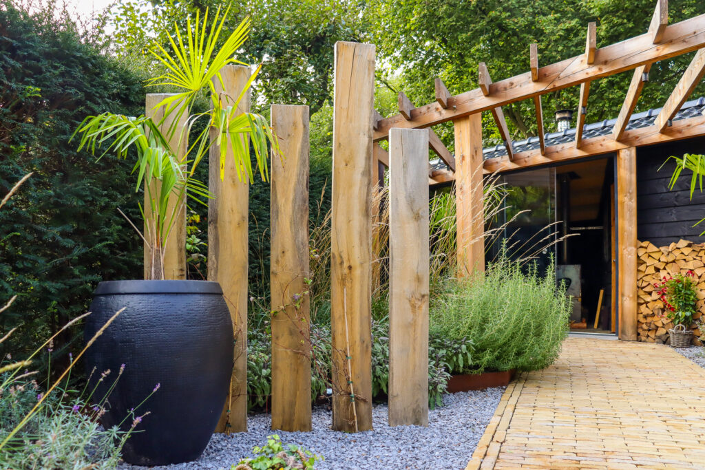 Deze bijzondere relaxtuin waant je even aan de kust in Zuid-Frankrijk. De bijzondere, hoekige vormgeving wordt verzacht door zachte materialen. Het geeft de kleine kavel diepte en een warme, vriendelijke uitstraling. Je zou bijna vergeten dat de tuin zich in Nederland bevindt.