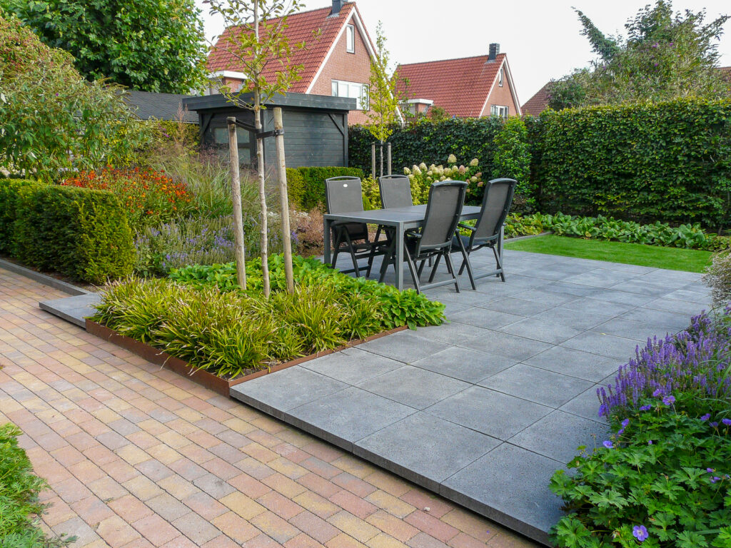 Een tuin met veel hoogteverschillen, een mooie uitdaging! Het hoogteverschil tussen het terras en het gazon is opgevangen door duurzame cortenstalen randen. Het terras is omsloten door losse siergrassen en vaste planten. Door een combinatie te maken van klinkers en tegels, krijgt het terras een speelse en kenmerkende uitstraling. Door gebruik van zacht kleurige bloemen is er een mooi gebalanceerd geheel ontstaan. Puur genieten in alle tijden van het jaar!