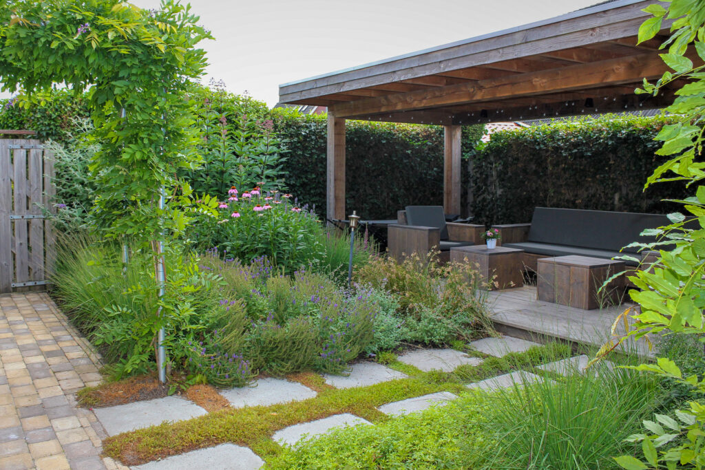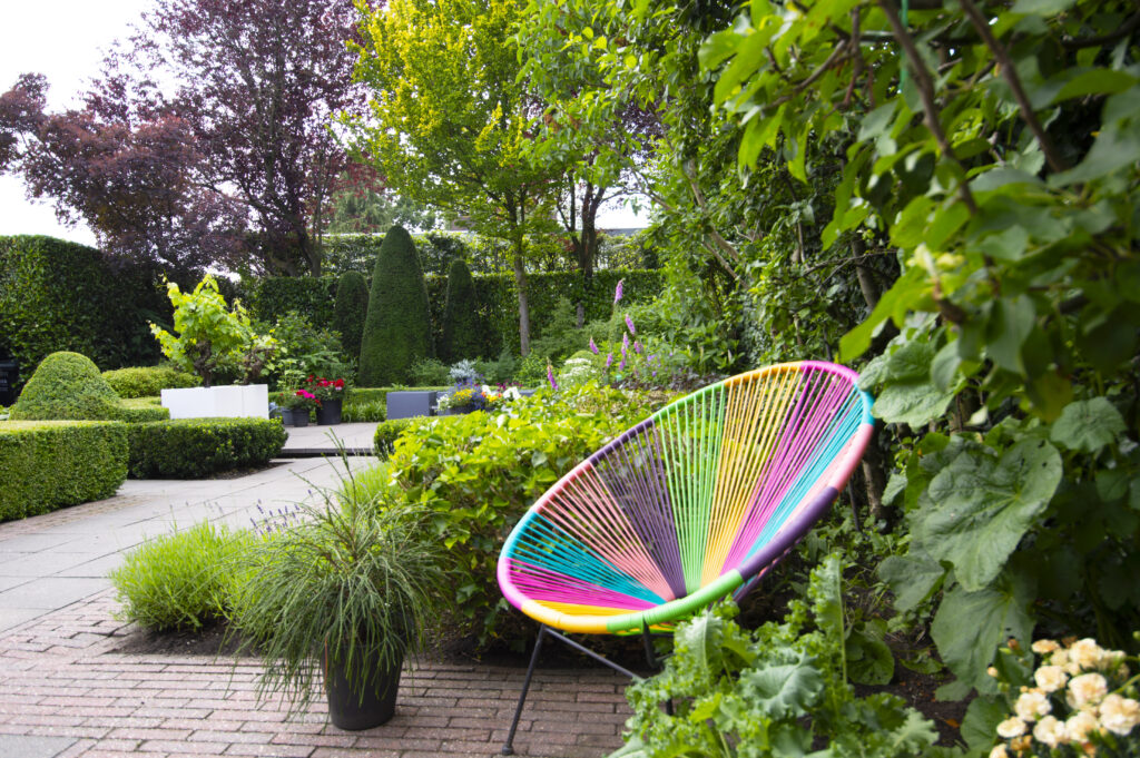 Een fijne tuin met veel kleur en met een heerlijke zitplek. Deze moderne leeftuin is van alle gemakken voorzien en is bovendien ook nog innovatief.